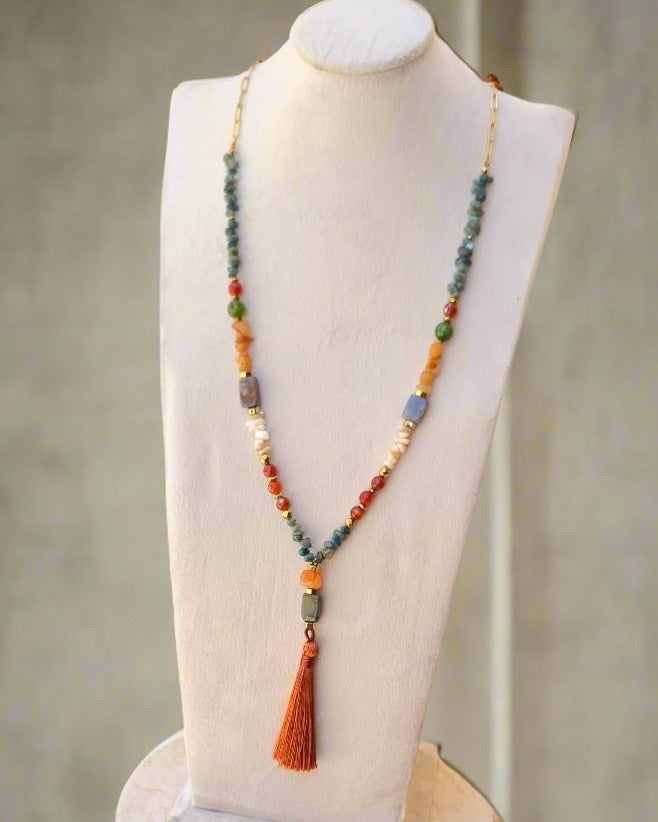 - Agate beads with hematite spacers , silk tassels and stainless steel chains & lock .