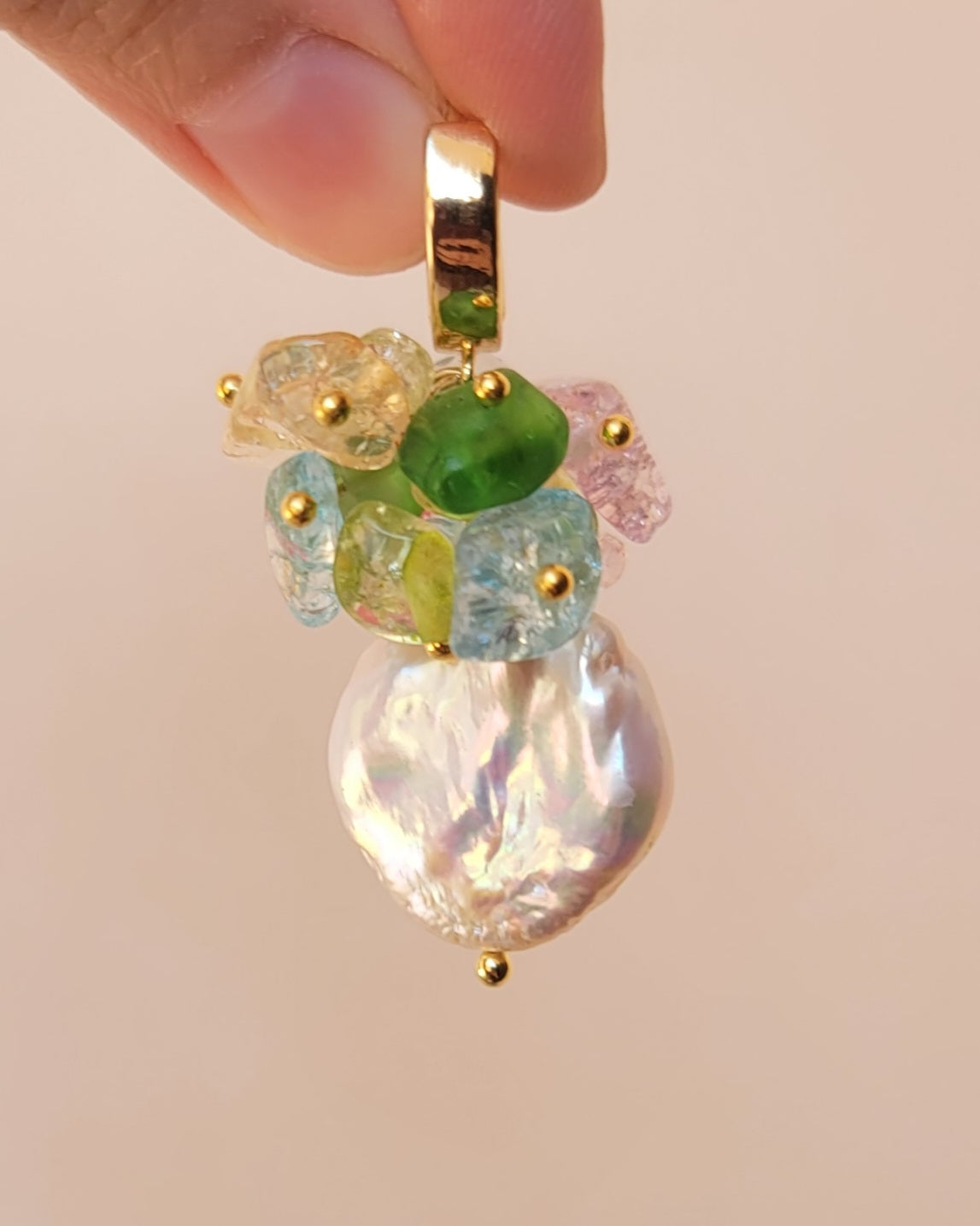 - Gold plated earrings with colorful stone chips and freshwater natural pearls.