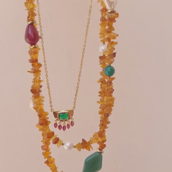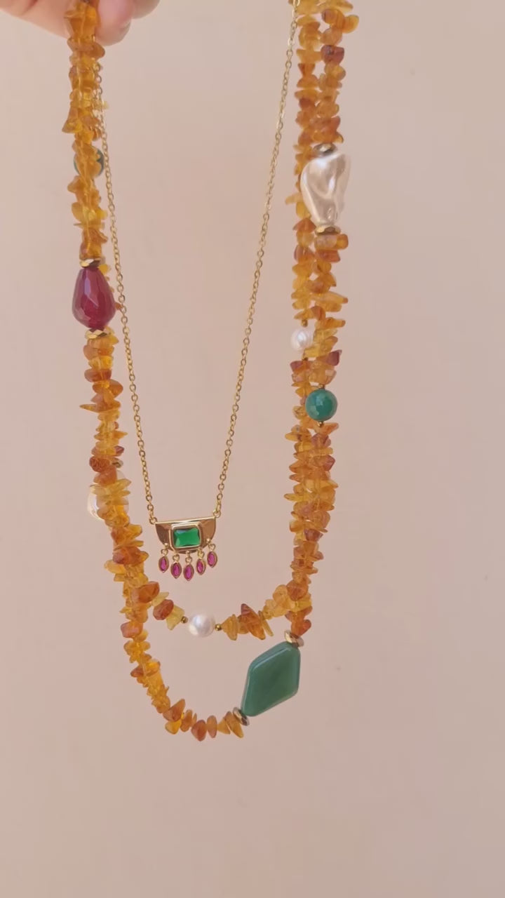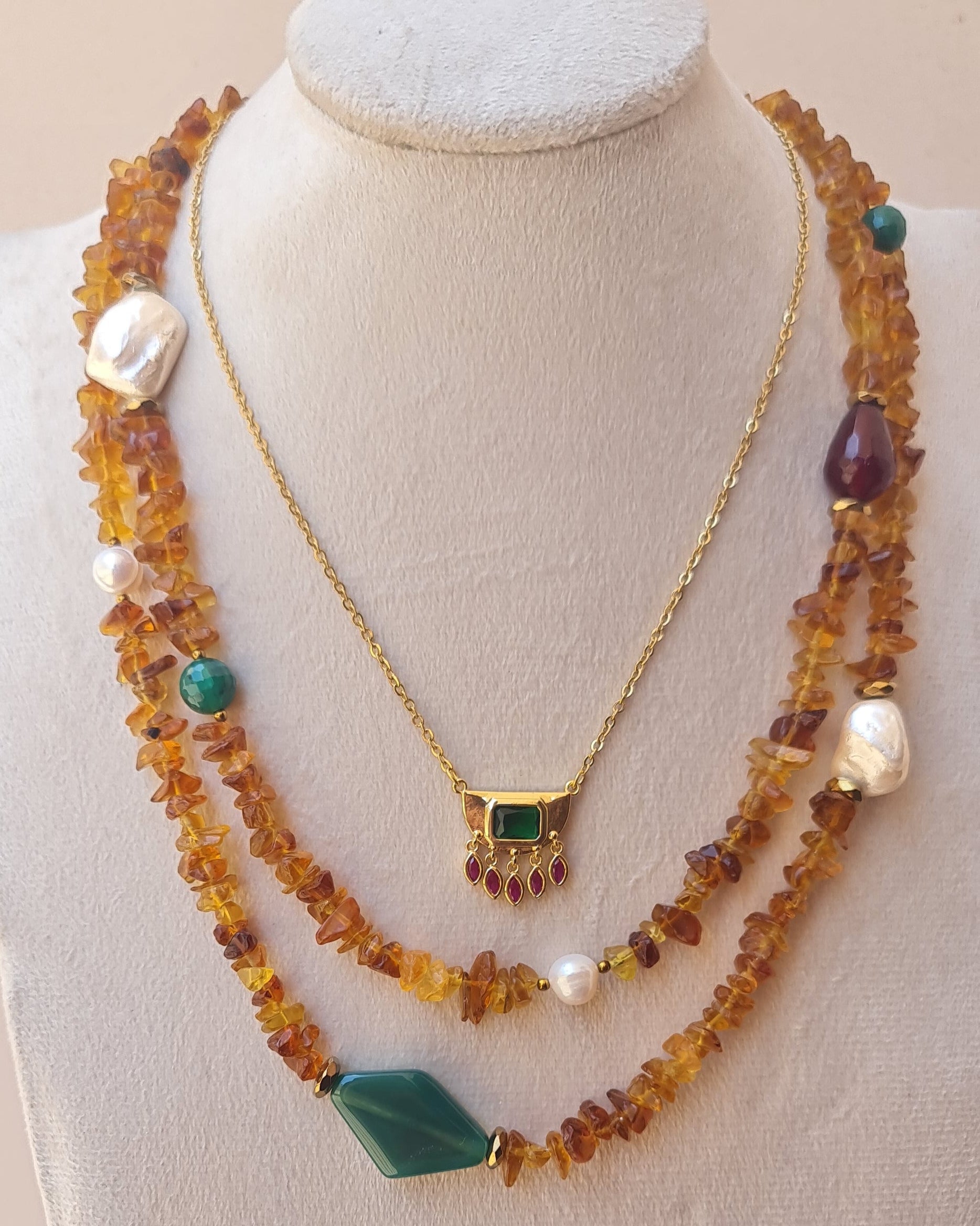 - Two layers Stone chips necklace with agate & fresh water pearls